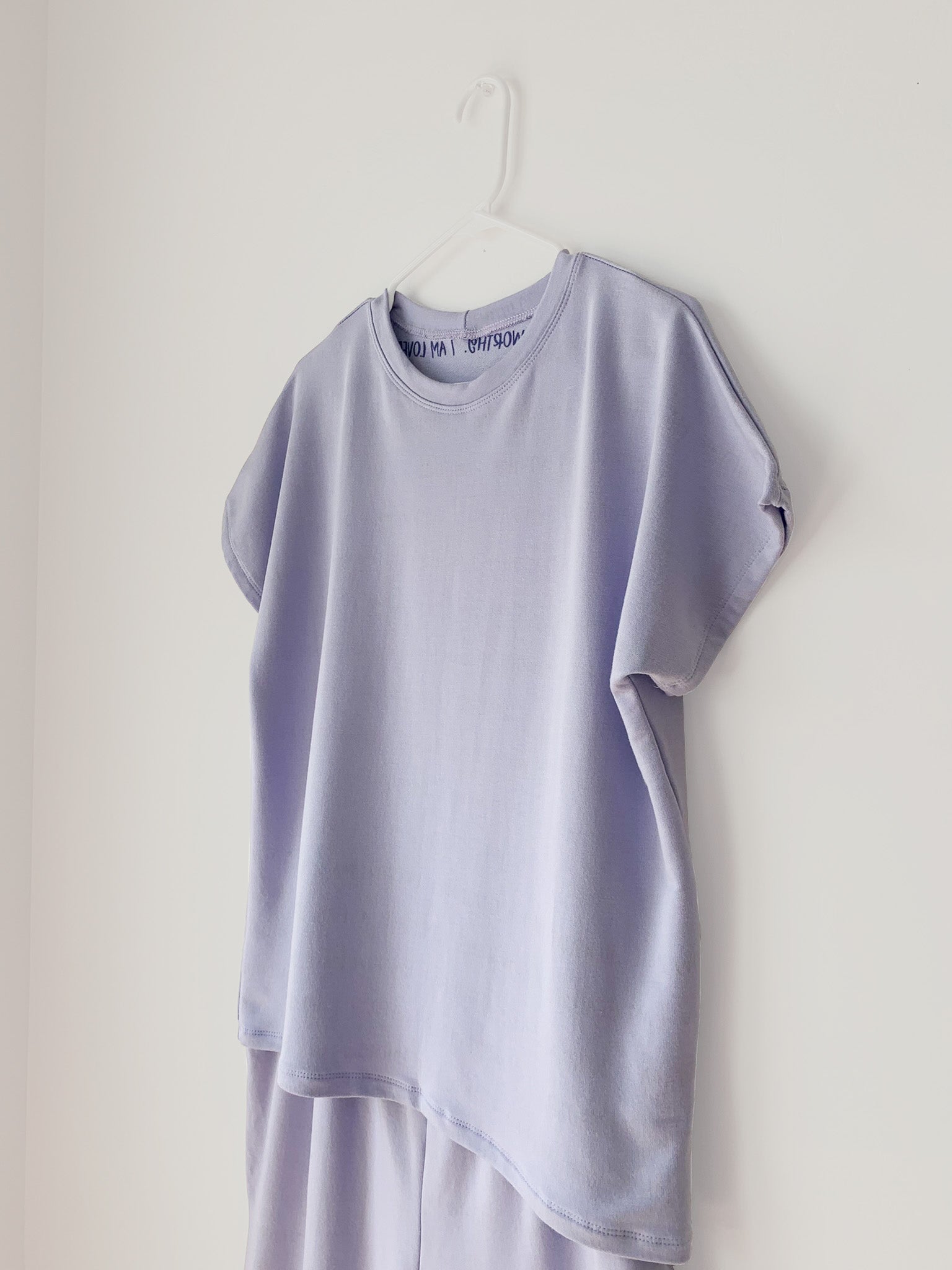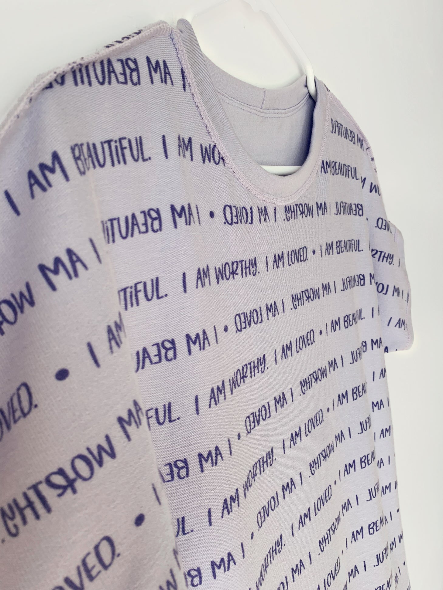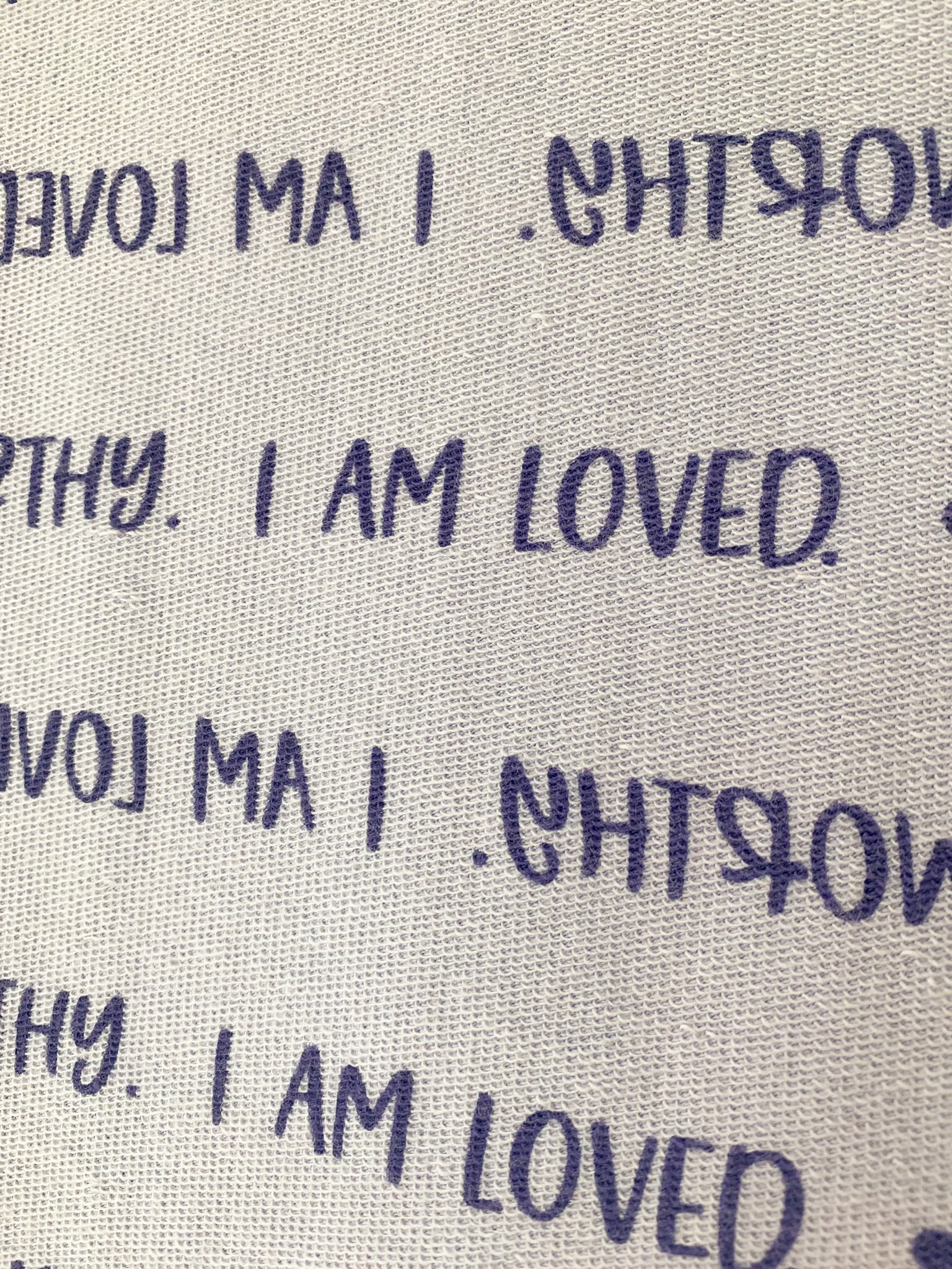 The printed affirmations on the interior side of the pajamas rest against the wearer’s skin, reminding her she is beautiful and worthy and loved. The fabric is chic enough to turn the pajama top inside out and share these words with others.